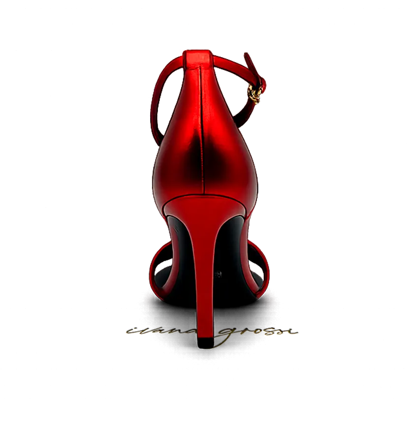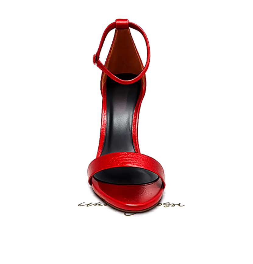 Merlin Red sandals are crafted from 100% genuine leather with a striking red metallic finish. The elegant 9 cm stiletto heel enhances the silhouette, while the ankle strap provides a secure and feminine fit. Perfect for evening wear and special occasions.